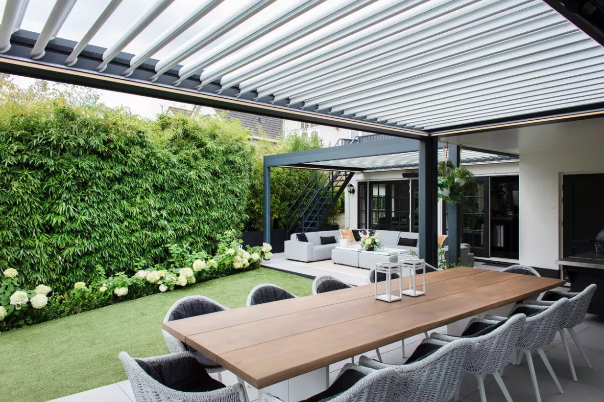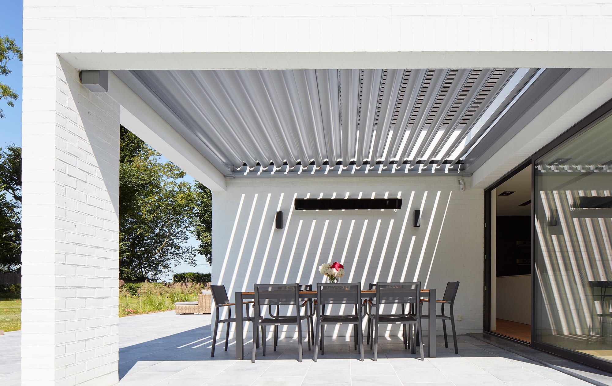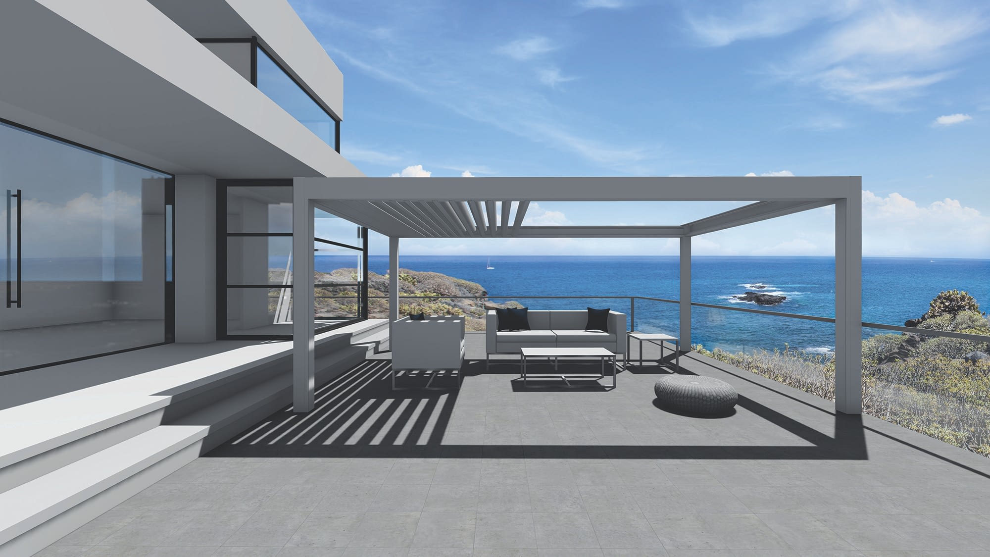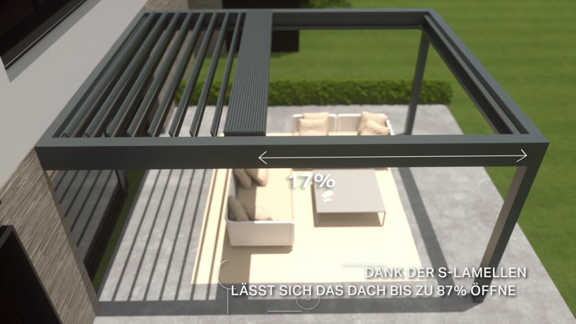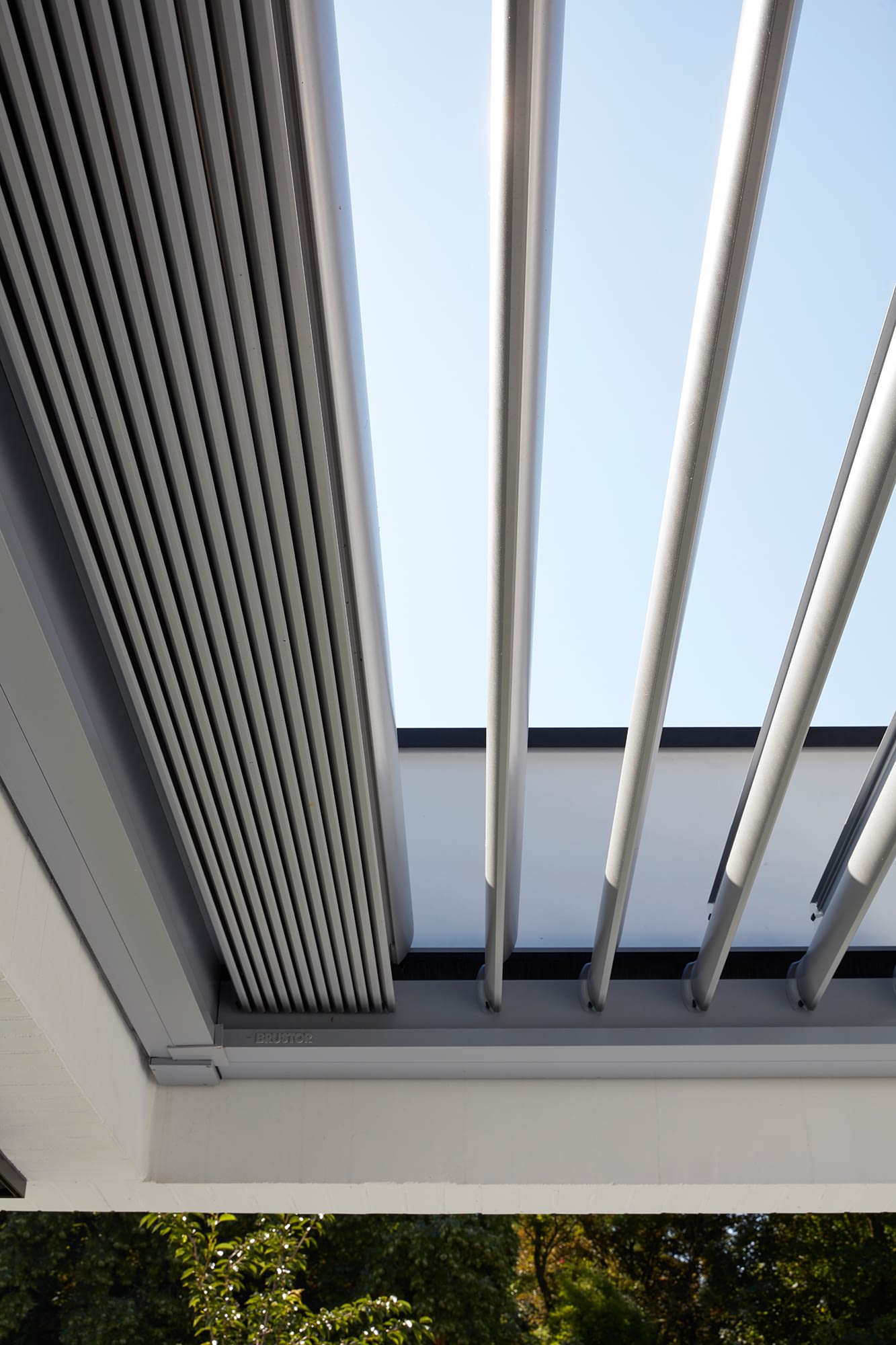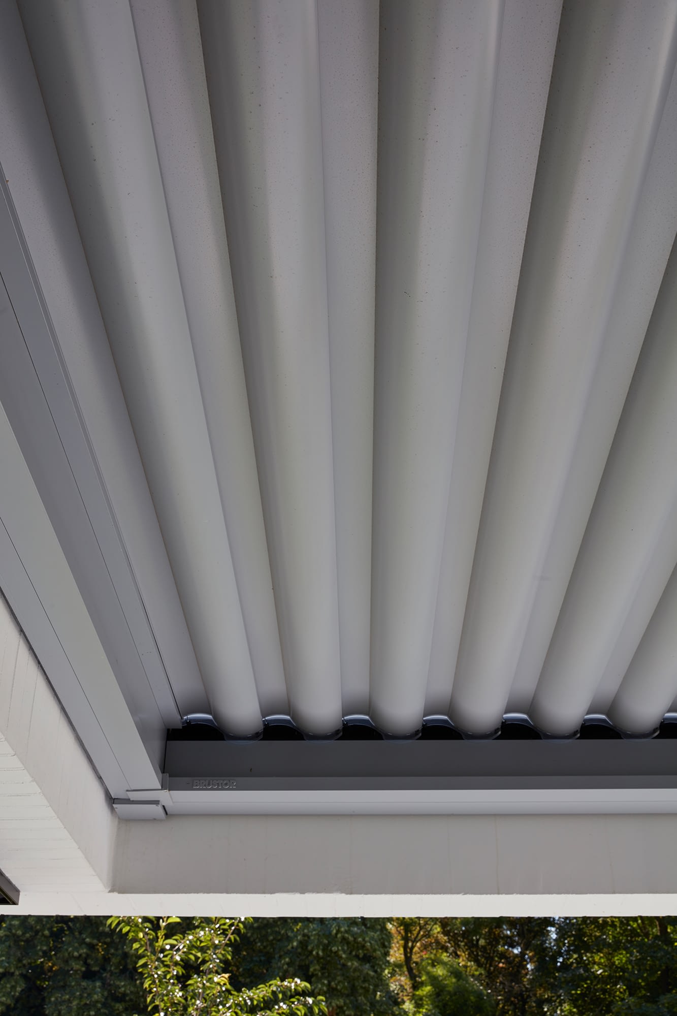 Das Dach der B600 S besteht aus drehbaren S-Lamellen, die sich auch aufschieben lassen. Bei vollständig geöffnetem Dach bleibt ein Lamellenpaket von nur 13 % der Gesamtfläche übrig – ein einzigartiges Merkmal, das nur Brustor bietet. Die Lamellen können in jede gewünschte Position gekippt werden, um den Lichteinfall und die Belüftung nach Ihren Wünschen zu regulieren. Das sorgt für optimalen Sonnenschutz und angenehme Kühlung an warmen Tagen.