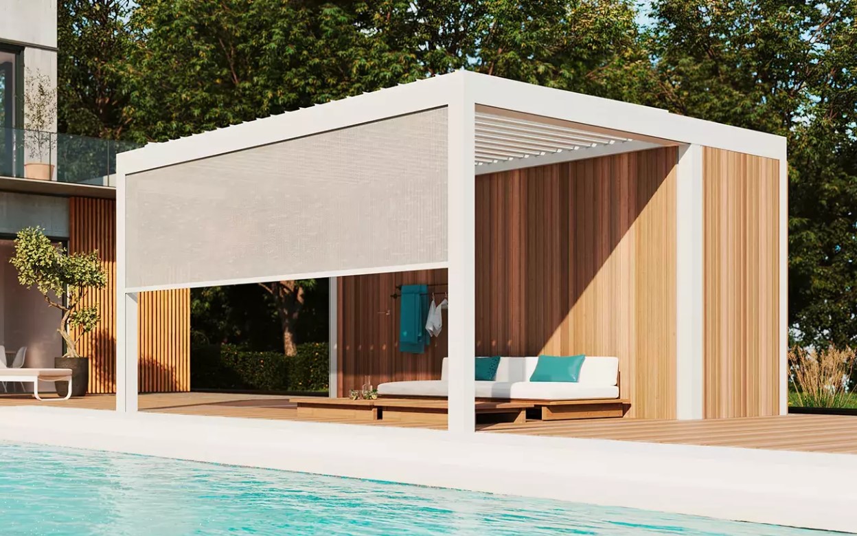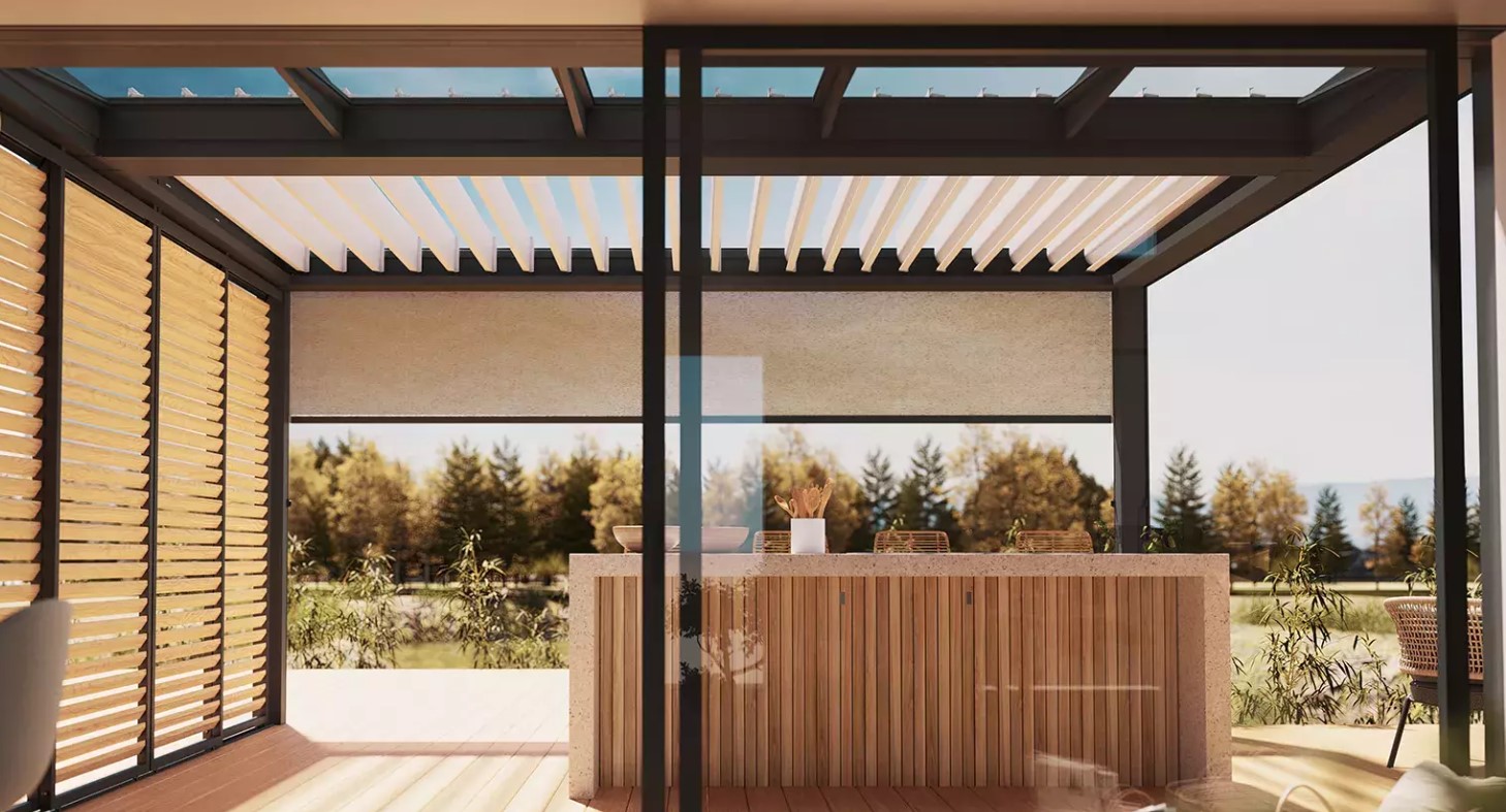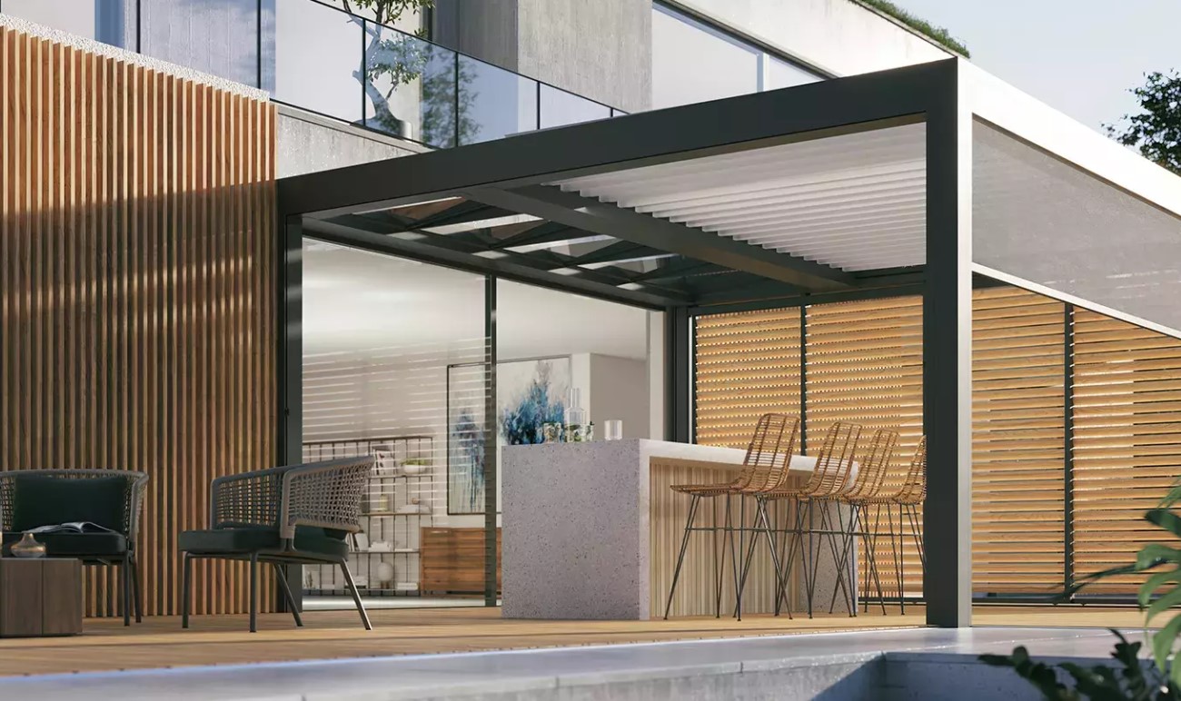 Es kombiniert ein Glasdach mit einem schwenkbaren Lamellendach, was die Einsatzmöglichkeiten enorm erweitert. Sie können einen überdachten Bereich für Ihre Gartenmöbel schaffen oder eine Außenküche installieren und gleichzeitig im Haus von optimalem Lichteinfall profitieren. Optional können auch integrierte Screens hinzugefügt werden. Dies sind nur einige der vielen Möglichkeiten, die das B720 bietet!