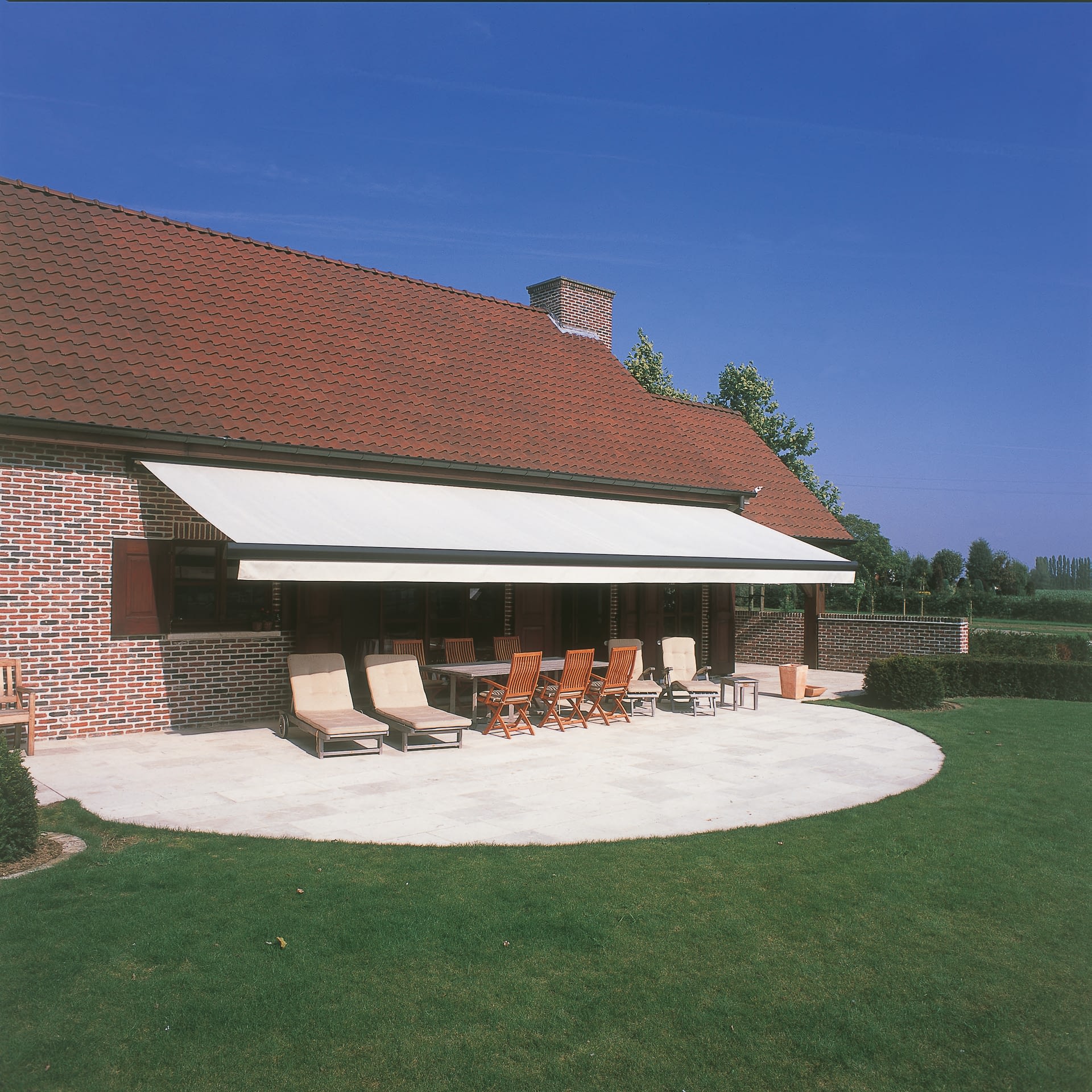Die vierfach verstärkten Stahlseil-Arme bieten außergewöhnliche Windfestigkeit, was diese Markise ideal für den Einsatz in der Gastronomie macht. Einfache Handhabung und beeindruckende Flexibilität zeichnen die B35 aus: Das Markisentuch kann in einem Stück bis zu einer Breite von 15 Metern gefertigt werden. Darüber hinaus stehen Ihnen neben den fünf Standardfarben auch 200 optionale RAL-Farben (gegen Aufpreis) und zahlreiche hochwertige Acrylgewebe zur Auswahl.